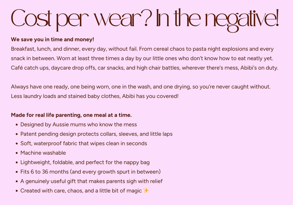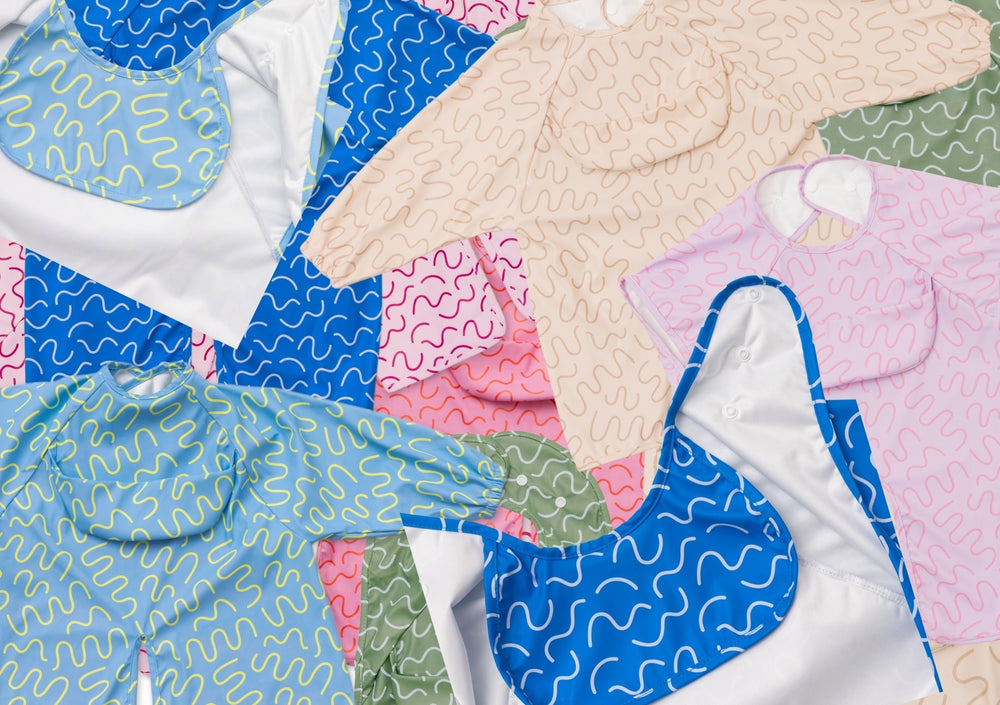 We designed the world’s first bib with a protective inner collar flap, high set food catcher, adjustable snap buttons, to grow with your baby, and a front leg split to finally stop food from ruining clothes during mealtime.
