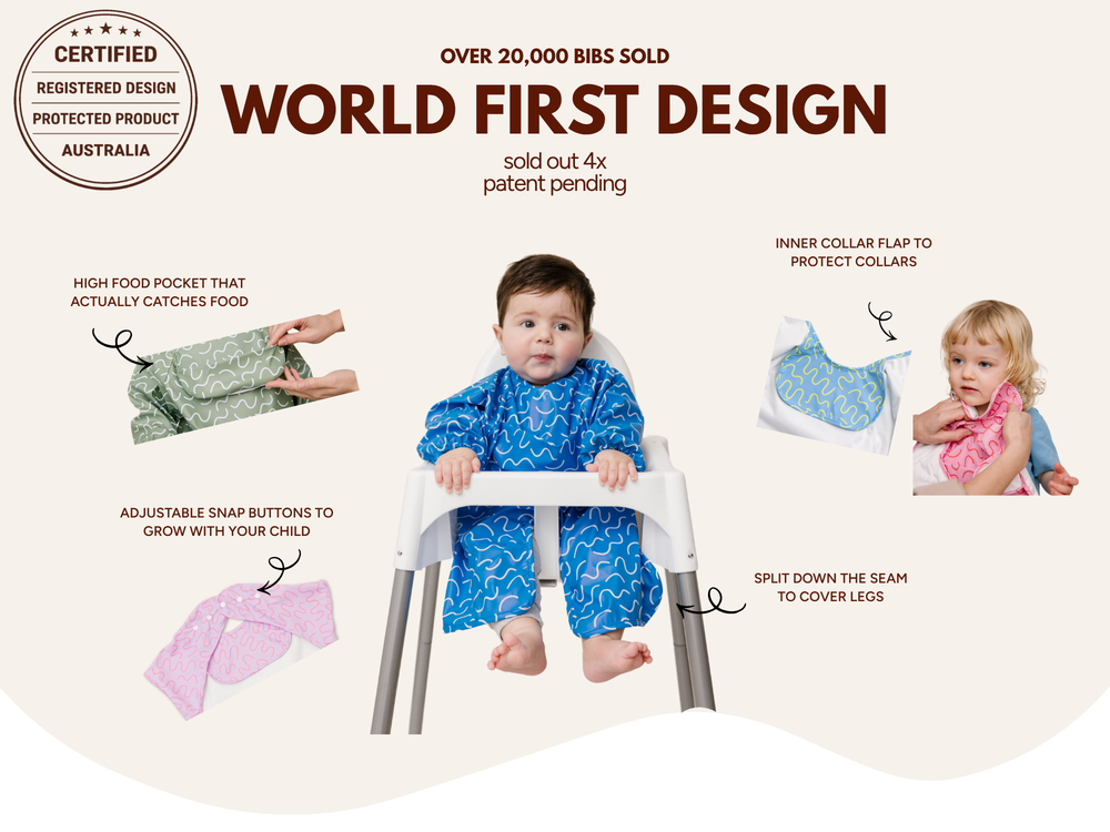 We designed the world’s first bib with a protective inner collar flap, a high-set food catcher, adjustable snap buttons that grow with your baby, and a front leg split to finally stop food from ruining clothes at mealtime.